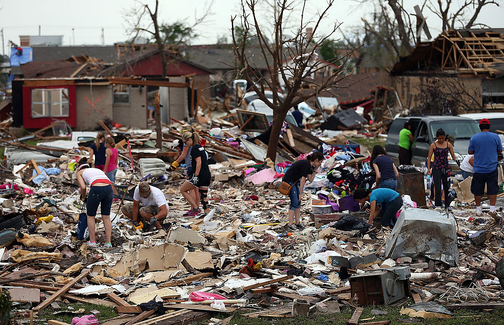 MOORE, OK – MAY 25: Volunteers help homeowners dig through a tornado ravaged neighborhood on May 25, 2013 in Moore, Oklahoma. The tornado of EF5 strength and two miles wide touched down May 20 killing at least 24 people and leaving behind extensive damage to homes and businesses. U.S. President Barack Obama promised federal aid to supplement state and local recovery efforts. (Photo by Tom Pennington/Getty Images)